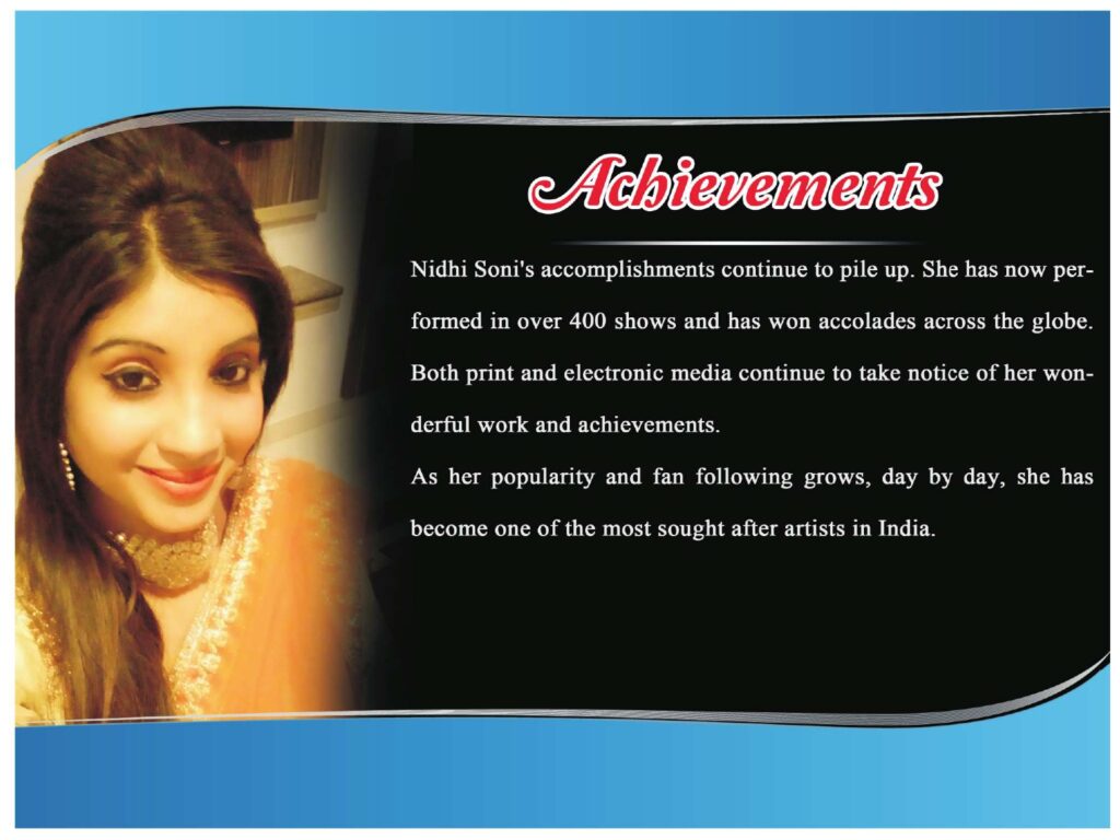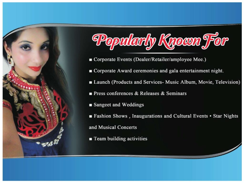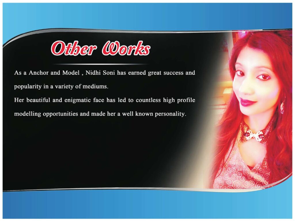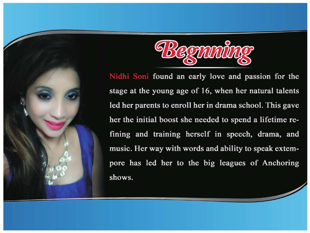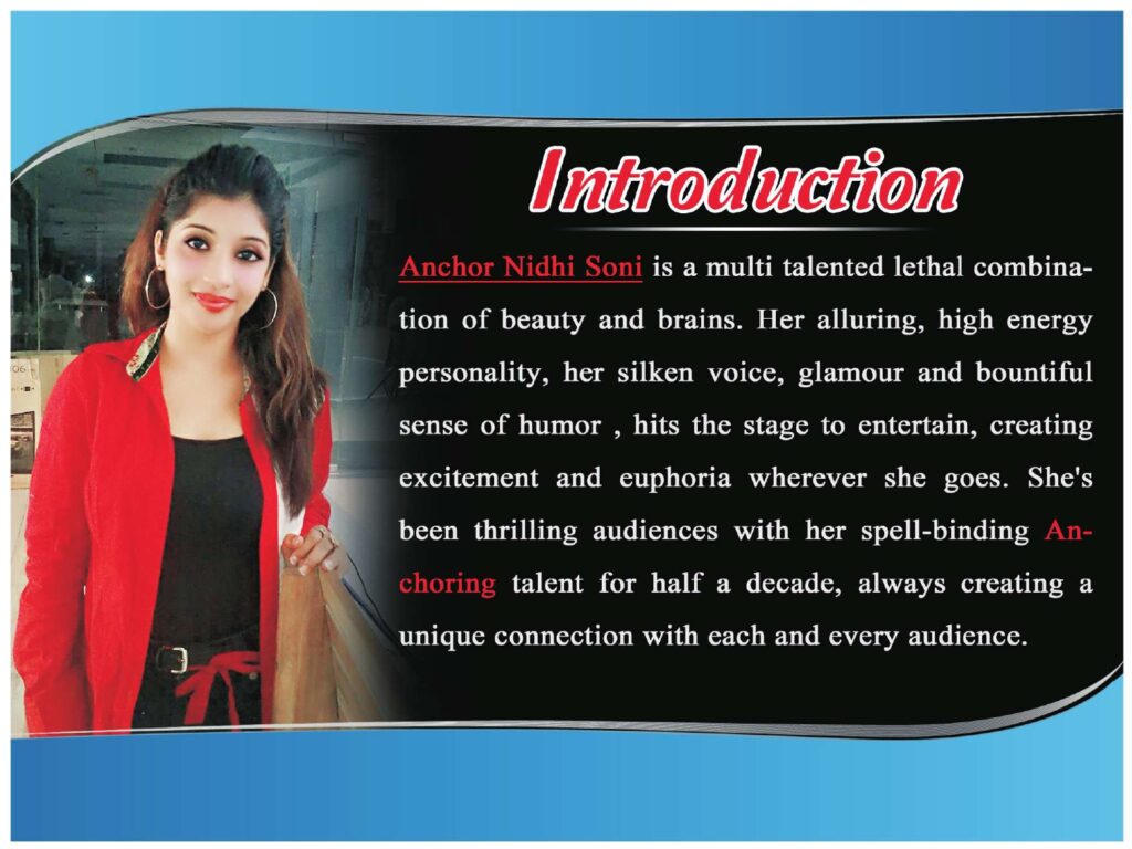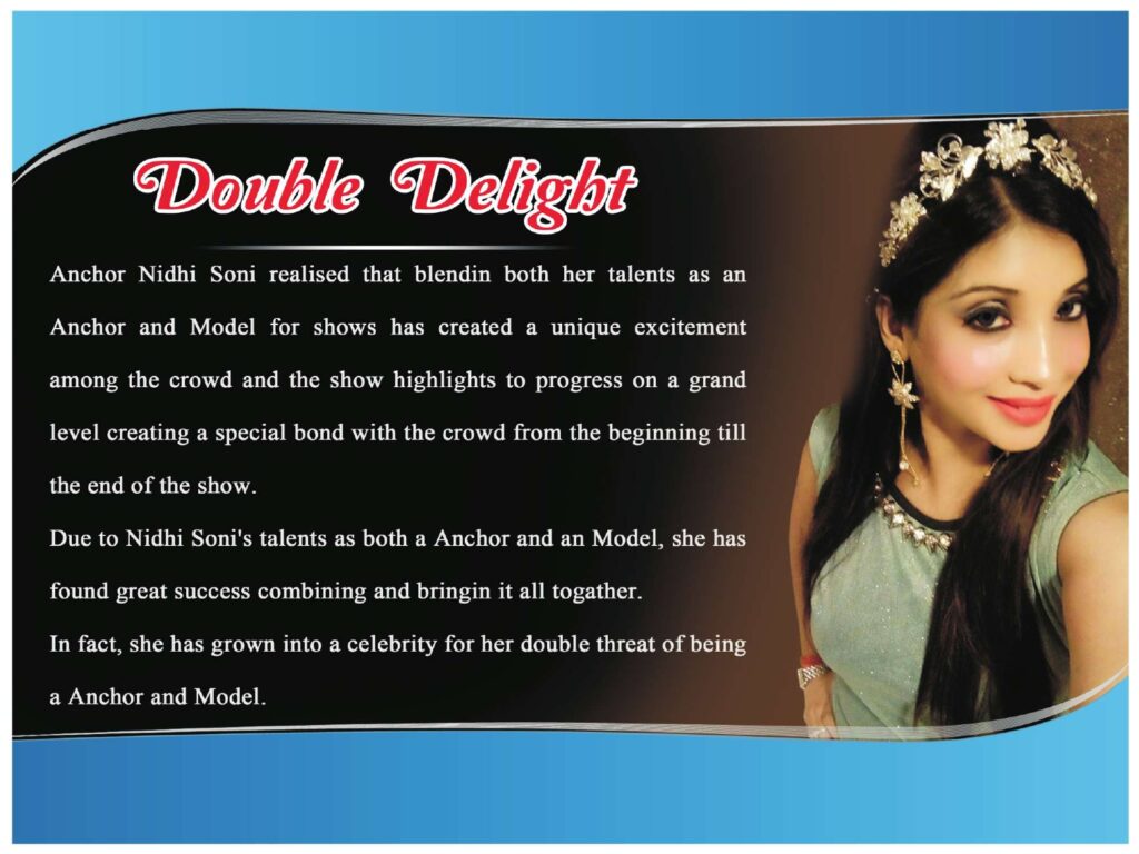 Nidhie Sonie has the distinct vocal style of a soul anchor, able to stir emotion in every note. Her husky, full bodied tones flow out and touch each and every listener. Nidhie Sonie realised that blending her talent as an anchor for shows has created a unique excitement among the crowd and the show highlights to progress on a grand level creating a special bond with the crowd from the beginning till the end of the show. In fact, this was a perfect example of blending all of her talents together, because she was the only Indian anchor to open the act and anchor for the show in front of an audience of 50,000 people. Due to Nidhie Sonie’s talent as both a actor and an anchor, she has found great success combining the two and is now well known as a “Anchoring Emcee”. In fact, she has grown into a celebrity for her double threat of actor and anchor. “My ability to improvise and play off the audience helps me create a comfortable atmosphere. This, more than anything, has made me a successful anchor and a vocalist. It’s God’s Gift. I strive to empower them with my voice and feel invigorated by the encouragement of the audience.” As a model and Anchor Nidhie Sonie has earned great success and popularity in a variety of mediums. Nidhie Sonie‘s accomplishments continue to pile up. She has now performed in over 400 shows and has won accolades across the globe. Both print and electronic media continue to take notice of her wonderful work and achievements. As her popularity and fan following grows, day by day and has become one of the most sought after artists in India. Achievement has been awarded as best anchor in 2014 it was mesmerizing time award by Times of India, Hindustan, Chemist and Druggist federation.